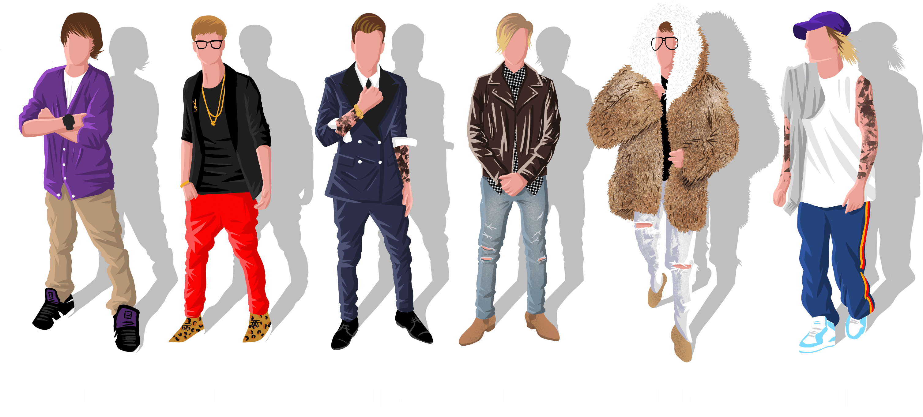2019 - Now married to Hayley Baldwin, Bieber's style has taken a backseat. Recently labelled a' Scumbro' by Vanity Fair, this new trend involves taking a sloppy approach to wearing expensive, designer clothing.